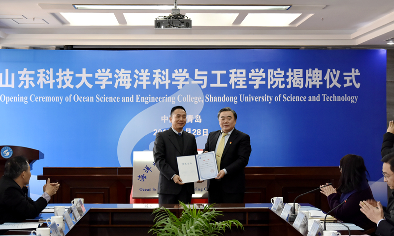 罗公利和李铁刚共同为海洋科学与工程学院揭牌。经校所双方酝酿讨论,决定聘任自然资源部第一海洋研究所周兴华研究员为海洋科学与工程学院院长,姚庆国为周兴华颁发了院长聘书。