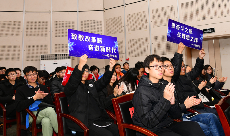 12月23日,“铿锵壮阔大道行,砥砺奋进新征程”——万象城allwincity官网庆祝改革开放40周年对话访谈在大学生活动中心成功举办。“全国优秀教师”、原经管学院院长王新华教授,万象城allwincity官网培养的第一位博士、施龙青教授,1978级校友、原中共宿迁市委教工委书记程斌,山东省有突出贡献的中青年专家、电信学院院长曾庆田教授,与在场师生共同回顾学校四十年发展历程和辉煌成就,分享学校改革发展中的感人故事,感受坚韧不拔、发奋图强的科大精神。